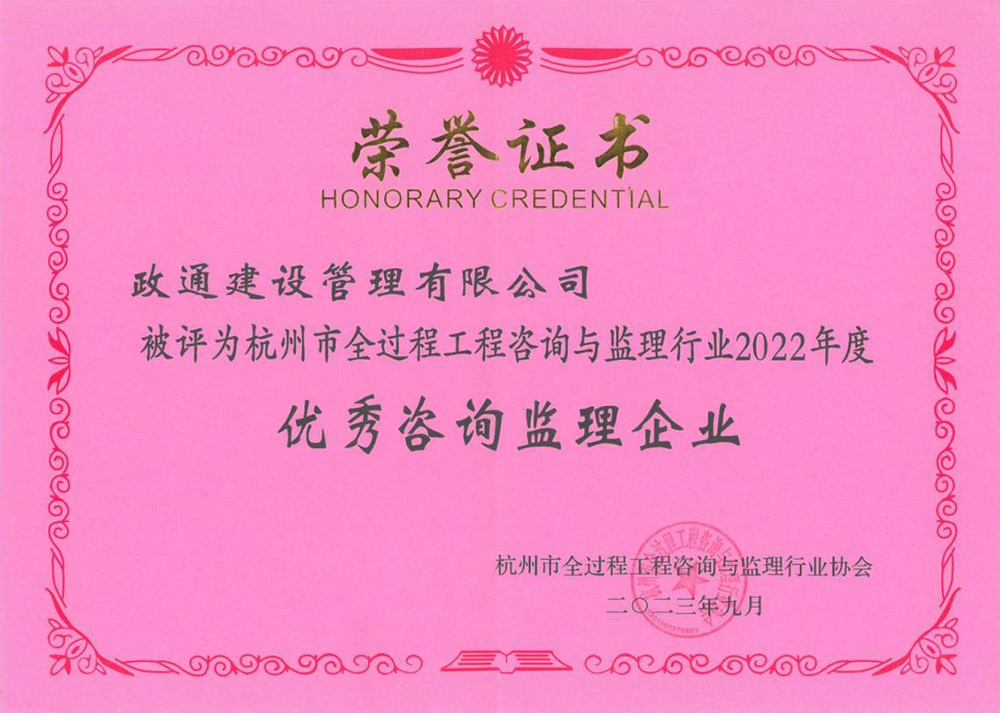近期,杭州市全过程工程咨询与监理行业协会下发《关于公布杭州市全过程工程咨询与监理行业2022年度优秀(先进)企业名单的通知》(杭咨监协(2023)9号),经专家评审及公示,我司被评选为2022年杭州市优秀监理咨询企业。我司连续多年获评杭州市优秀监理咨询企业,本项荣誉的获得是行业协会对我司肯定与认可,也是对公司提升品质服务的鼓舞和鞭策。