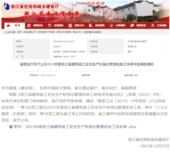 近日,浙江省住房和城乡建设厅下发《省建设厅关于公布2023年度浙江省建筑施工安全生产标准化管理优良工地考评结果》,其中OB欧宝手机中国有限公司所监理的闲林东路拓宽提升工程、年产5000台(套)高端液压设备项目(3#车间、连接通道、办公楼、液氧专用建筑),荣获2023年度浙江省建筑施工安全生产标准化管理优良工地。