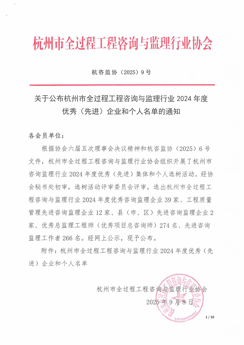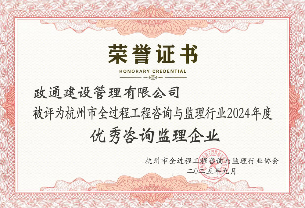 2025年9月8日,杭州市全过程工程咨询与监理行业协会正式发布《关于公布杭州市全过程工程咨询与监理行业2024年度优秀(先进)企业和个人名单的通知》(杭咨监协(2025)9号),我司荣登榜单,再度获评“2024年度杭州市优秀咨询监理企业”。